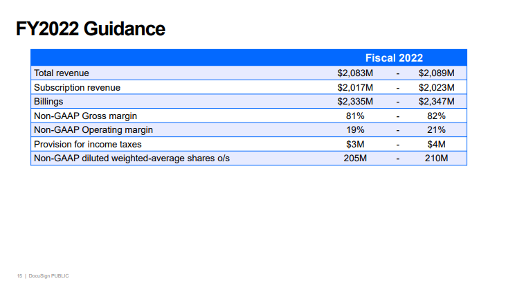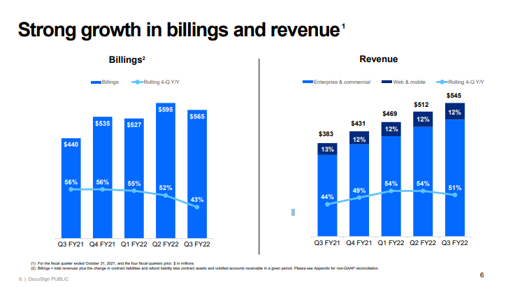 However, DocuSign has been growing at an impressive 40% before the pandemic, and 50% during the pandemic. Even in fiscal '22 they've been growing above 50% for each quarter.