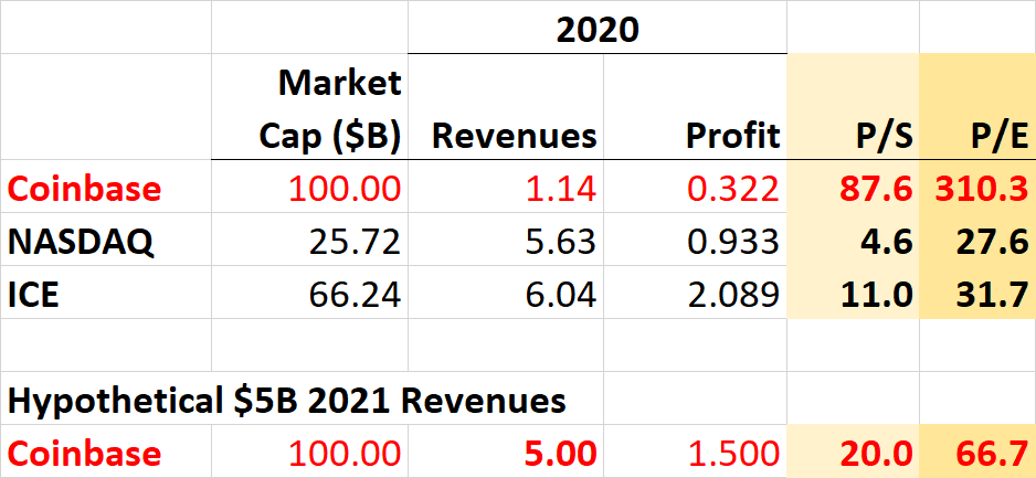 Assuming Coinbase ends 2020 with $5B of revenues and a 30% net income margin, they're still valued at 3x their peers!