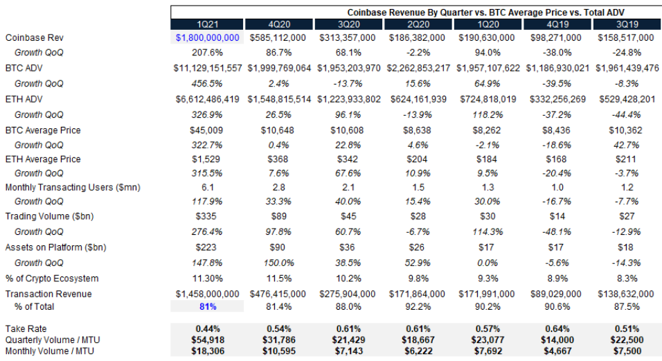 Coinbase is expected to be valued at $100B or greater (likely greater). When you put that into perspective against the NASDAQ and ICE (NYSE) valuations, you can see how preposterous that seems – see Chart below. Sure, they had a blowout first quarter of 2021 ($1.8B in Q1'21 revenues) – which I'm sure was beyond anyone's wildest expectations – but the numbers still don't add up for me.