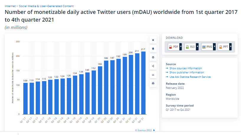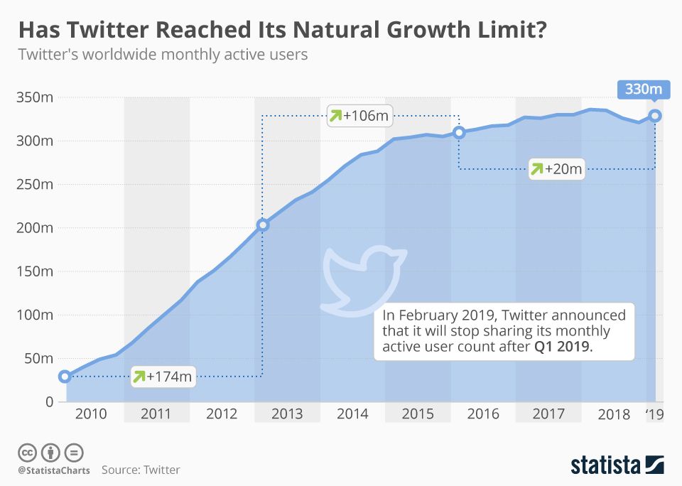 Twitter, like most social media companies, used to report Monthly Active Users (MAUs), but stopped in 2019... presumably because it seemed like they plateaued – which I think is going to be a problem for most social networks, especially since the pull-forward growth from the pandemic.