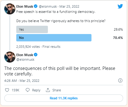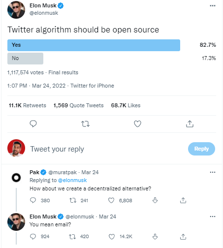On March 24th, Elon runs a poll asking if Twitter's algorithm should be open source. Not surprisingly, more than 80% of people said, "Yes". I found it interesting when Twitter user @muratpak suggested a decentralized alternative instead, Elon seemed to dismiss the idea. I am curious as to why Elon doesn't believe in a decentralized future of social media. But then again, I am judging his views based off a tweet.