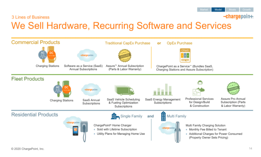 Along, with the massive charging network – which drives the bulk of its revenues, through either CapEx or OpEx customer purchases – Chargepoint also delivers Fleet products for charging and managing fleet, and Residential Products for single/multi-family homes. Chargepoint also recently acquired eBus and ViriCiti to advance its fleet management efforts.