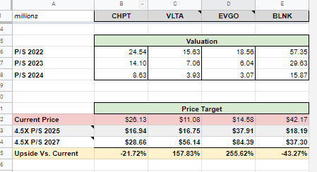 In terms of price targets, I used 4.5x 2025 sales as most of the weighting, and found the most upside with EVgo.