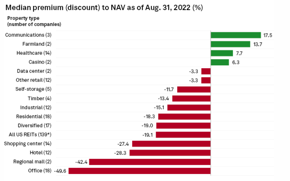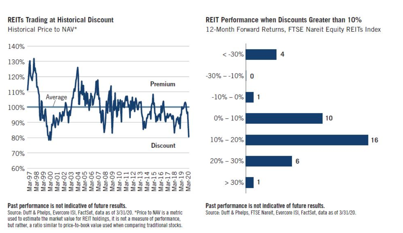 Previous crisis lows included a discount to NAV of 22% at the end of the dot.com bubble in December 1999; 17% in the GFC in February 2009; and 15% in the Taper Tantrum of August 2013. Had an investor purchased REITs during these three periods, their 12-month forward returns would have been 16.51%, 85.47%, and 19.35%, respectively. ā Duff & Phelps