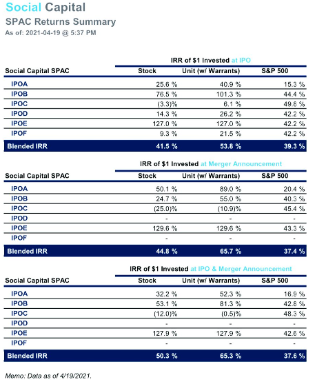 All of this, in short, leads to the SPAC market taking a nose dive and Chamath being the poster child of it all. He hasn't formally responded to the Clover Health allegations (which I'm more interested in), but he did apparently respond to Bloomberg's article on Twitter by posting the inception-to-date returns of his SPACs.