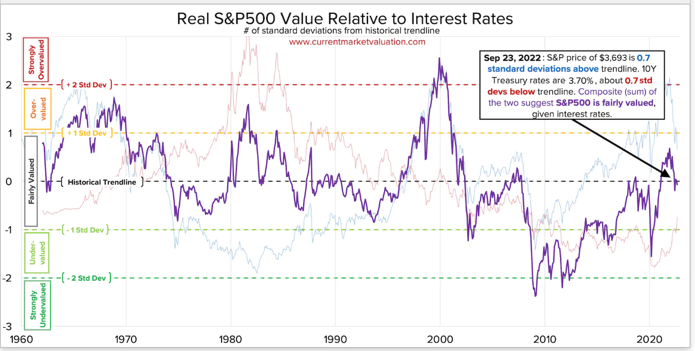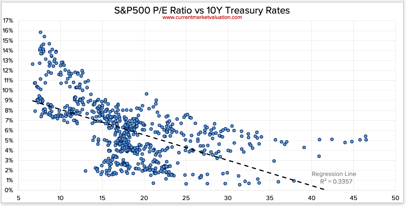 The ERP is, in theory, irrespective of rates, but with rising rates there are legitimate alternative to stocks are real rates rise. And hence, there is a correlation to S&P value and 10Y Treasury rates. Currently, that correlation indicates we are at fair value, however in times of crisis, we can see that we can go lower.