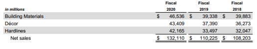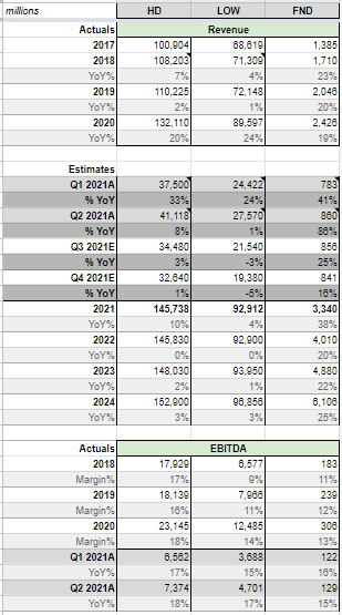 On the surface, both Lowe's and Home Depot are very similar businesses and direct competitors. They both have three segments of business: Home Décor, Building Products, and Hardlines. Home Décor includes Appliances, Décor, Flooring, Kitchens & Bath, and Paint. Building Products include Building Materials, Electrical, Lighting, Lumber, Millwork and Rough Plumbing. Hardlines include Hardware, Lawn & Garden, Seasonal & Outdoor Living, and Tools. Each of those segments make up an equal amount, or a third, of each of their businesses. So, both Lowe's and Home Depot is pretty much identical in their revenue split. Beyond comparing the two, I also wanted to see if any specific category was a abnormal beneficiary from COVID (demand, supply constraints, or inflation), which would make forecasting easier. However, all categories grew evenly – which indicates more "healthy" growth.