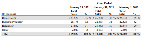 The home improvement industry, as you can see, had a significant boost of sales from the pandemic. People were stuck at home, and the pandemic allowed them to finally get around to their home improvement and DIY projects. It was the perfect storm to stimulate the industry. Home Depot grew sales 20% in 2020, while Lowe's grew 24%. These are huge numbers!