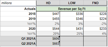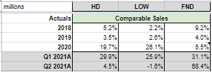 When we dig deeper into comparable sales – which is a more telling metric – we see that Lowe's was down -1.5% in Q2 2021, whereas Home Depot was +4.5%.
