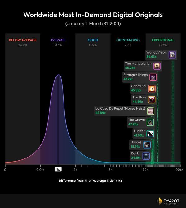 This is a list of the most in-demand shows during the first quarter. Netflix accounts for 7 of the 10, but Disney+ and Amazon have entries as well. Note that Disney+ has the two biggest.
