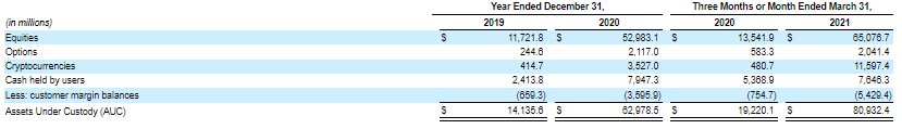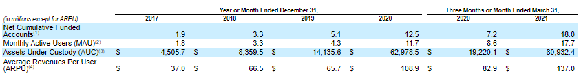 Most of Robinhood's users are pretty active. Most funded accounts are active each month – which makes sense. Assets Under Custody (AUC) is total user funds that are invested through the platform. Right now, that number is $80bn – which is up 320% from last year. ARPU also grew to $137 or 65% YoY.