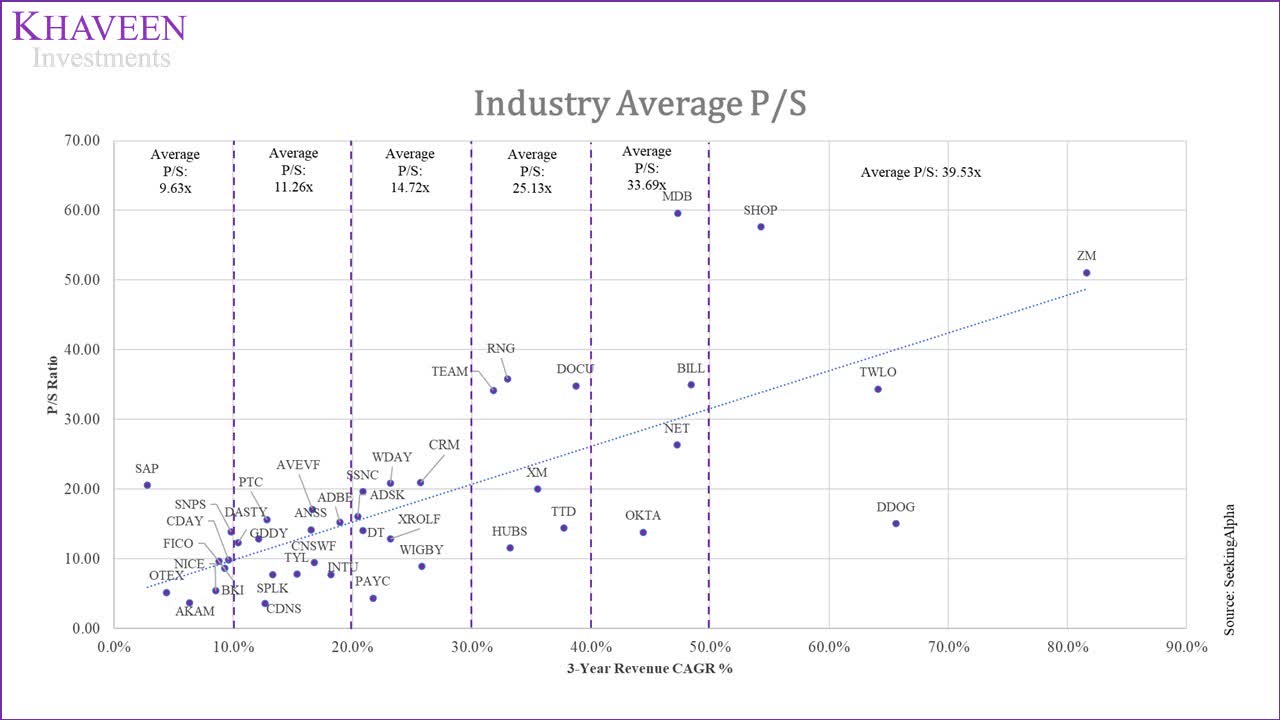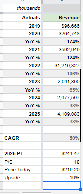 But, let's start with 2025 price target, assuming a 50% CAGR of revenues to $4.1bn... what multiple should be use? Based on industry averages relative to CAGR, and especially benchmarking CRM (Salesforce) I feel comfortable with an 18x P/S ratio. That gives us a price target of $240... which is only a 10% upside from here. There's no margin of safety.