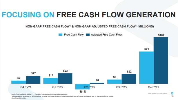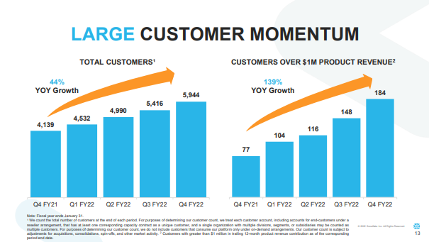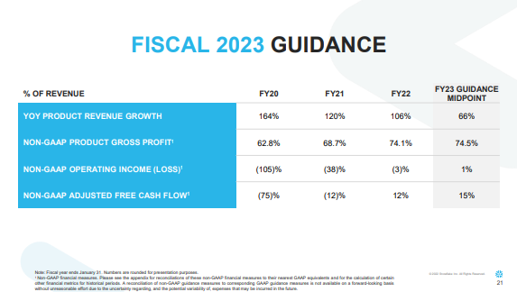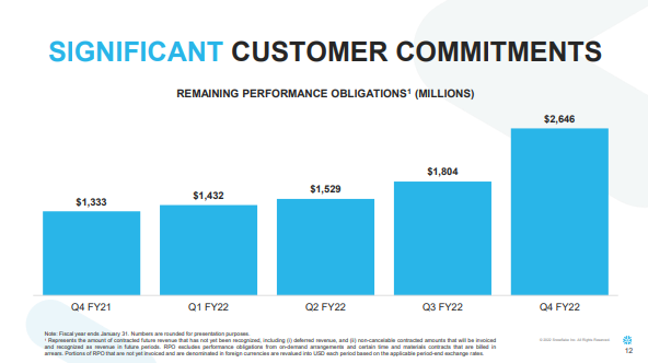 Snowflake generated a total of $1.2bn for fiscal 2022, which is a 100% YoY increase. They guided to a 66% increase in fiscal 2023, which is about $1.9bn. Given they have $2.6bn in RPOs, I think they can easily achieve this number.