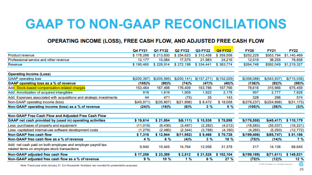 Though Snowflake is starting to now generate free cash flows, I won't be modelling it on a DCF basis because the uncertainty is very high at this point. There's no point. You can also see that the it's only generating positive free cash flow right now, because of its stock-based compensation. The spending model reminds me a lot of Salesforce. Which is why, even with a DCF analysis you're essentially you're calculating a FV per share based on share-based compensation which dilutes shareholder value. It just doesn't make sense to give that much weight imo.