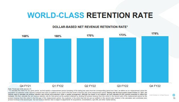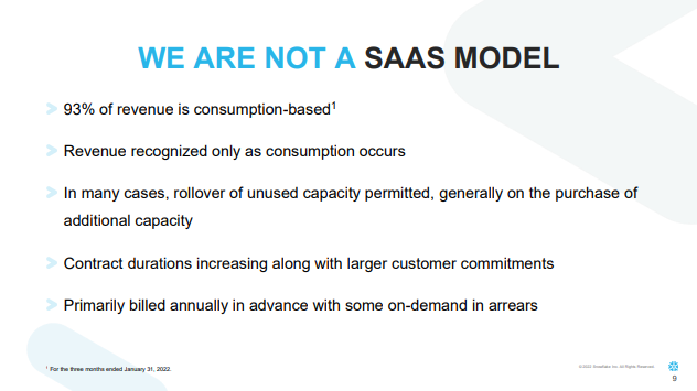 First, we need to understand Snowflake's billing model. They are not a SaaS, and most of their revenues are consumption-based – based on usage of their cloud platform. They don't have long-term commitments, but there is still stickiness to their platform which you can see in their dollar-based net revenue retention rate – customers are staying on and spending more.