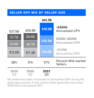 To start, we take a look at GPV and notice the growth rate declined significantly in 2020 (due to COVID), where it only grew 6%. This tells me, right away, that a lot of the volume for Square must take place with physical retail businesses as e-commerce stores were COVID beneficiaries. Based on the metrics provided, we can see that the Seller ecosystem generates about 90% of the calculated GPV. But, Cash App is a growing piece. We also see that most of the transactions are from smaller businesses – which were significantly more impacted during COVID... and I'm still questioning their recovery.