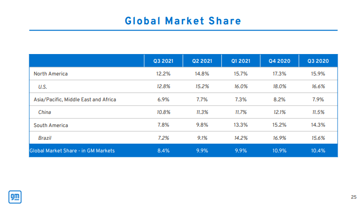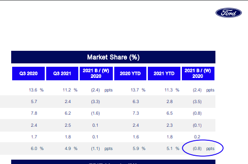 I primarily ย measured their respective business performances, the same way I measured Tesla's, is with deliveries. They both have declining deliveries, with a questionable comp period in 2021 because of the 2020 pandemic and chip shortages. It's really hard to give any one an edge over the other. But, what's clear is GM is much bigger, so it is losing global market share at a faster rate than Ford.