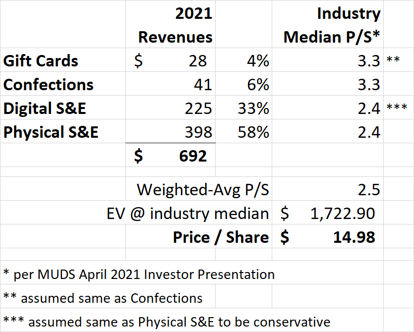 Based on the above, it's fair to expect Topps to carry a 2.5x revenue multiple, giving us a price per share of $15.00 – which at it's current price of $11.50, presents an immediate 30% upside.