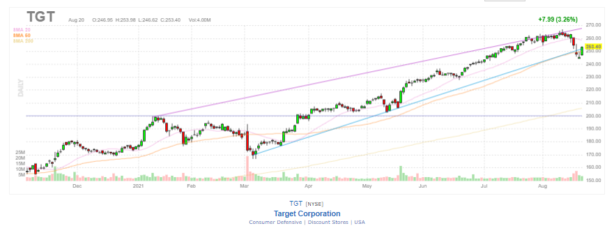 From the three consumer defensive stocks, at this point, an entry into Target is justified, in my opinion. It recently dropped on earnings report, which I think is going to be the case for many pandemic beneficiaries. This is the exact same swing trade I played with WMT – but, I think the opportunity with TGT is much greater, because of its higher growth. But, of course, Target is higher risk because it has to do more proving of its new strategy. I am curious to see how well its own brand sales hold up – because if 36% of their sales are coming from their own brands, their going to be a long-term winner... but especially during back-to-school and holiday season. The small entry into Target makes sense for me, but keep in mind the risks ahead with the Fed meetings before year-end.