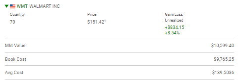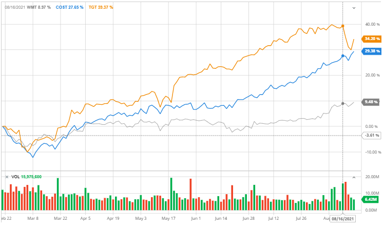 Target had a healthy pullback after their last earnings report due to growth concerns. From a technical perspective it's questionable whether this is a good entry point, since we might experience lower prices. I personally expect the same to happen to Costco after earnings are reported on Sep 23, 2021. The markets will have a hard time digesting slower growth post-COVID for any pandemic beneficiary imo. Walmart stock has had a pretty disappointing performance recently. However, as we know, past performance doesn't indicate future results – but it helps identify momentum.